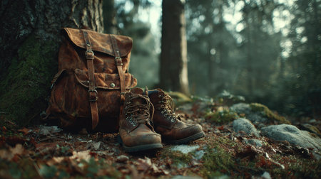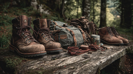 A collection of rustic hiking boots and outdoor gear beautifully arranged on a wooden table in a serene forest setting, showcasing a perfect blend of nature and adventure.