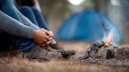 Hikers relaxing by a campfire, soaking in the warmth and ambiance while enjoying a cozy evening near their tent during a memorable camping trip in the serene wilderness
