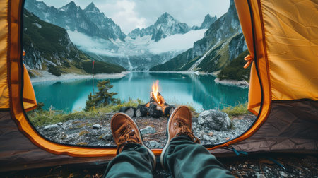 View from inside a tent of a person relaxing with a mug, enjoying the stunning mountain lake scenery.. AI Generation