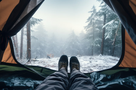 First person view from tent camping in snow covered wild field. Winter seasonal concept. AI generated.