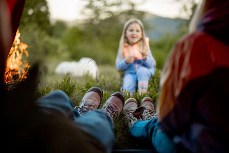 Cute little girl tell some story to her parents that sit in camping tent, View from the inside of tent. Childhood, storytelling and bonding with nature concept