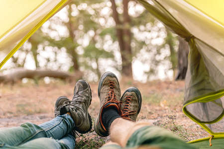 Rest in a tent in the forest. Human feet in a campsite, first person view