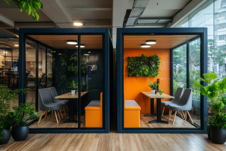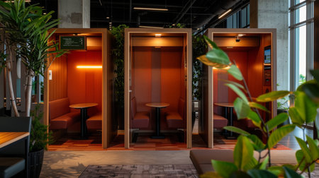 Cozy Booths in Modern Workspace With Lush Green Plants in Daytime