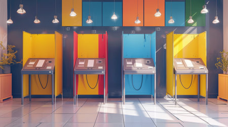 Voting booth setup with colorful privacy screens and ballot boxes Cartoon vector