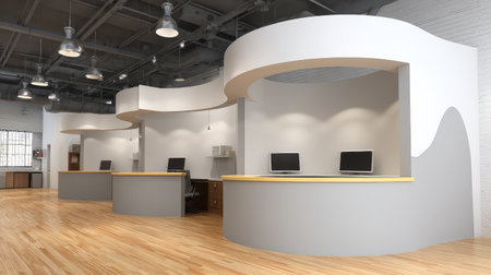 Modern coworking space with curved desks, overhead lighting design, and space for text overlays on walls