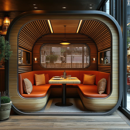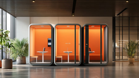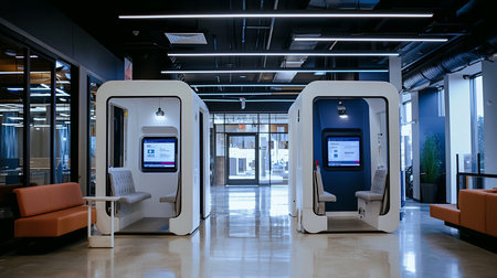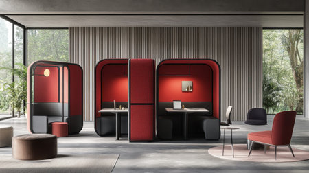 Comfortable booths in a modern office space offer privacy for focused work and collaboration, enhancing productivity and well-being