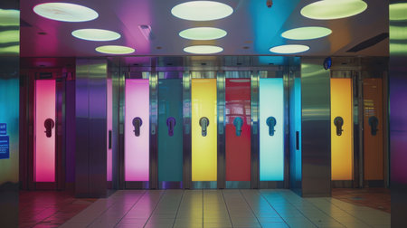 A striking display of colorful doors in a modern public building, featuring vibrant hues and unique lighting, creating an inviting and artistic atmosphere.