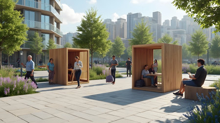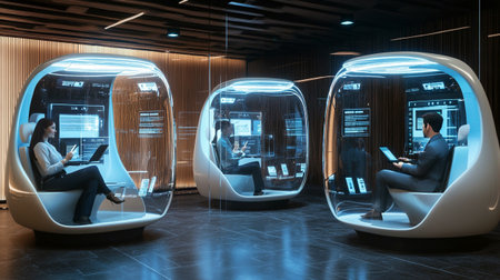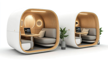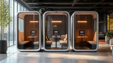 Stylish wooden booths provide private workspaces in a contemporary office environment, enhancing focus and collaboration