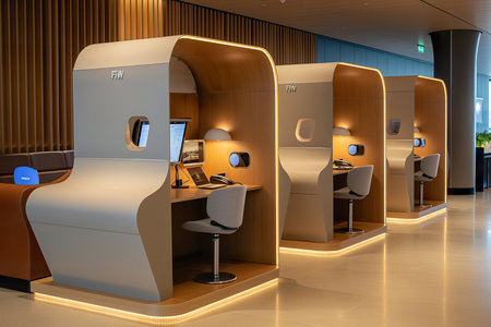 Private, soundproofed workstations with desks and comfortable seating are offered in an airport lounge.