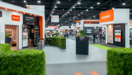 Vibrant exhibition center a dynamic trade fair with modern booths and engaged visitors