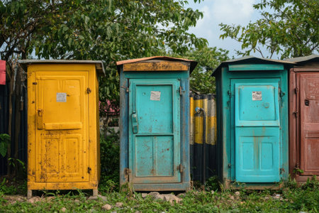 Four outdoor toilets in vibrant colors stand close together amidst lush greenery, showing signs of weathering.