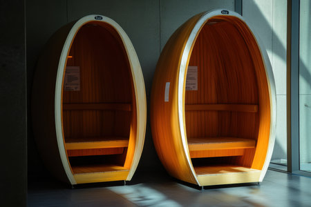 Two contemporary wooden pods designed for relaxation are placed in a well-lit indoor environment.