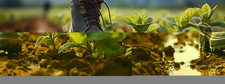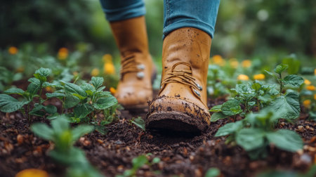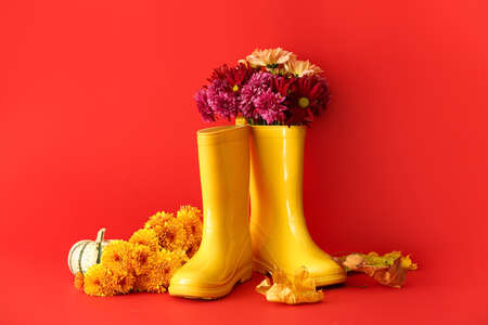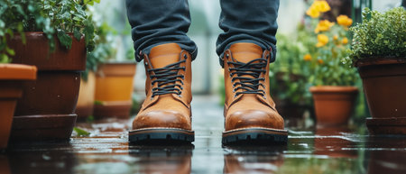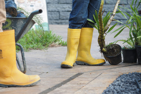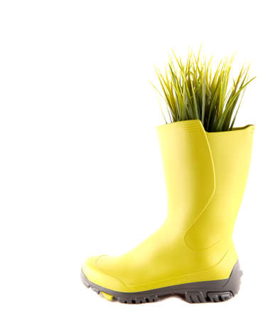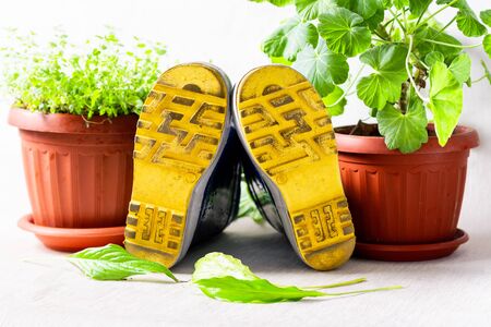 gardening, rubber yellow boots, potted plants on a white background with dew drops
