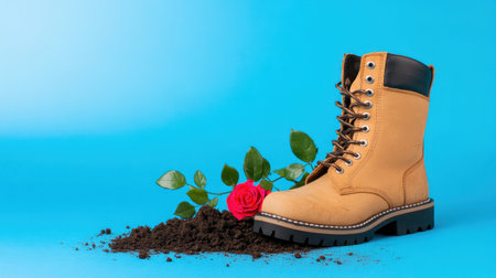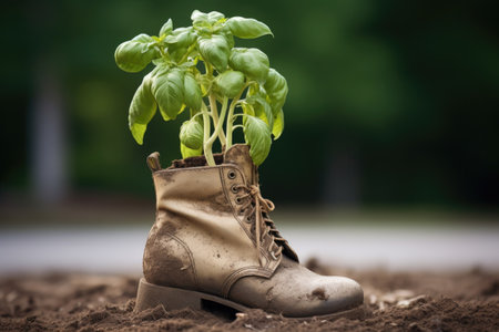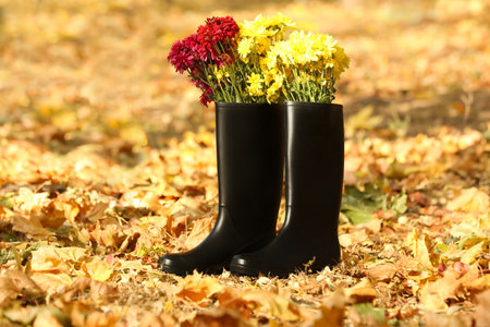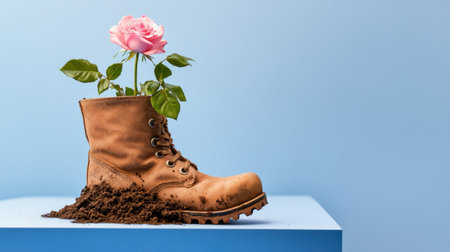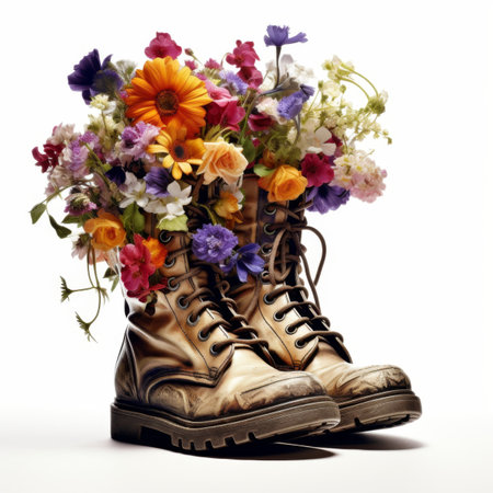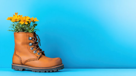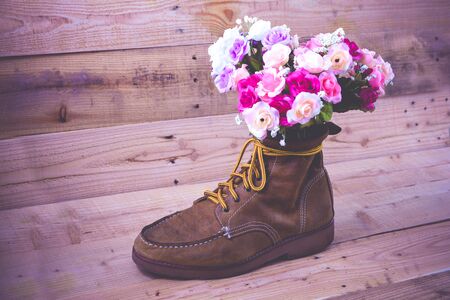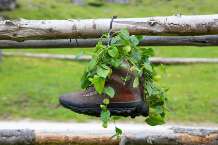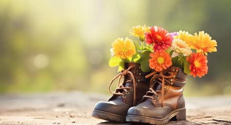 Touristic boot with flowers in the forest. Summer background with forgotten boots and wild flowers. Concept of summer season and traveling.