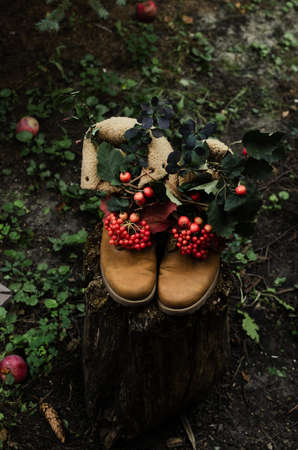 Top view of hiking boots with red berries and leaves standing on the stump in the forest.