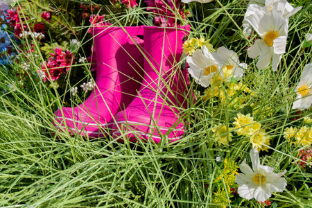 Pink Rubber boots in a composition of flowers and grass. A bright spring composition with the concept of gardening and farming. Spring discounts and mood. Garden Goods Store