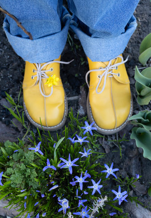 Hello, spring. Yellow shoes next to blooming small blue flowers. Natures rebirth