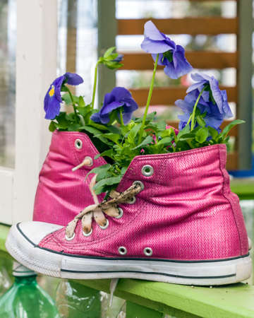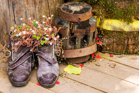 Old boots used as flower pots in vilage next to Vitebsk. Republic of Belarus.