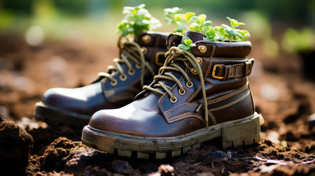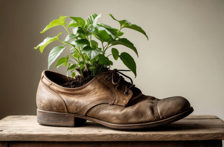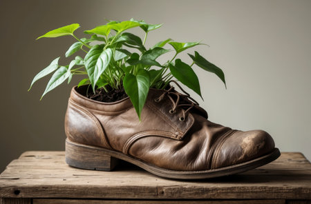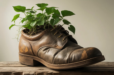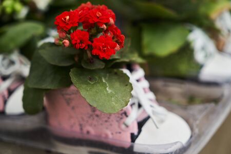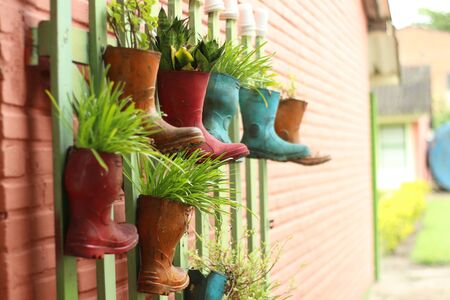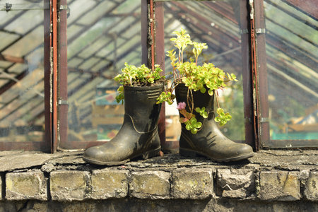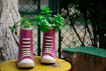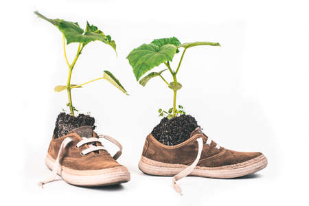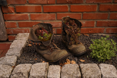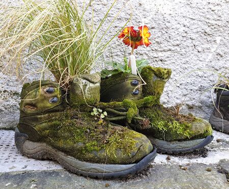 In old dirty brown shoes, earth is poured and plants are planted. Old shoes are used as a flower garden. The original flower bed on the background of a brick wall. Ideas for a garden and flower bed. garden decor. close-up.