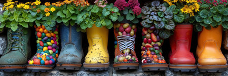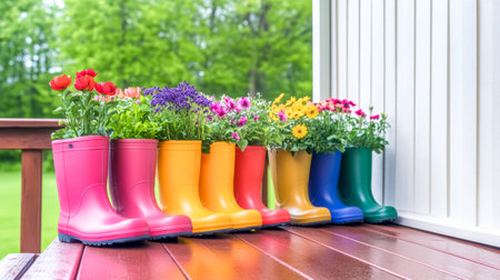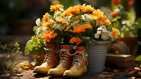 A vividly colored garden scene showcases yellow boots, potted flowers in various pink and yellow hues, and gardening shears on a wooden deck, representing the joy and vibrancy of gardening. AI generated image