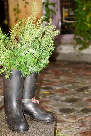 Two pairs of rubber boots with a bouquet of green mint on the stone steps on the street against the backdrop of green trees. soft focus.