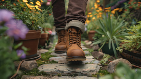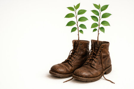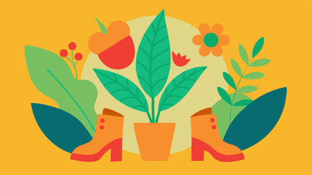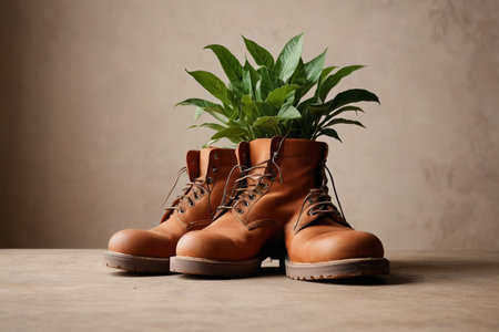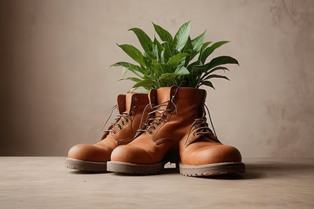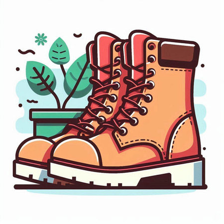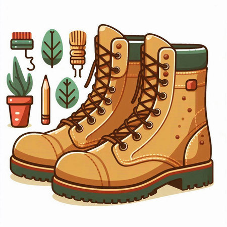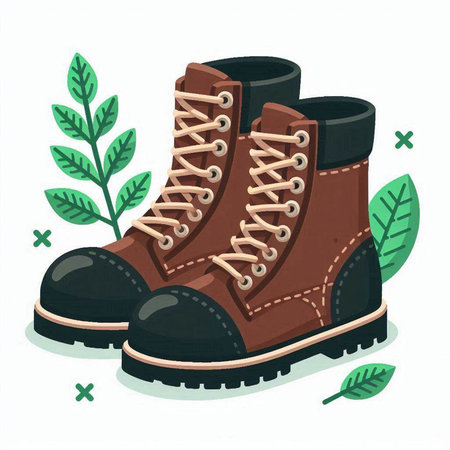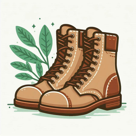 Vector illustration of a pair of brown leather hiking boots with green leaves.