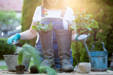 Woman gardener transplanting flowers in pot. Concept of home garden, spring activities..