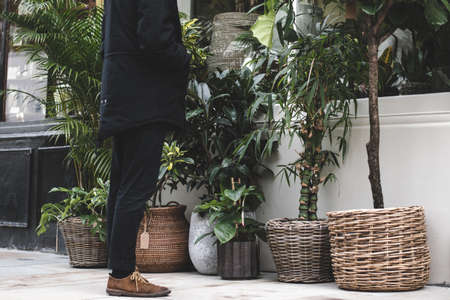 A well-dressed man looking inside a boutique plant shop in the city of London.