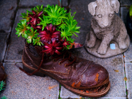 Old boot repurposed as colorful planter with succulents in a garden setting during daytime