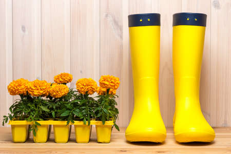 yellow rubber boots and seedlings of orange marigold flowers concept spring planting