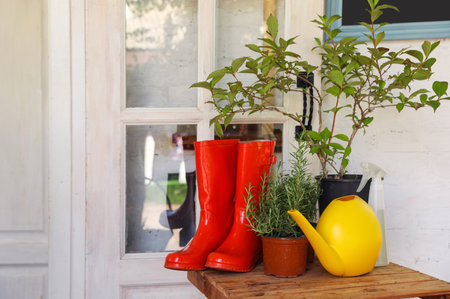 Potted plants, rubber boots and watering can on wooden table near house. gardening tools