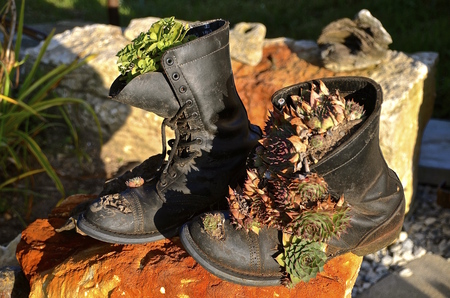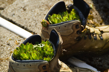 The chicken plants were planted in old hiking boots, which now beautify a garden