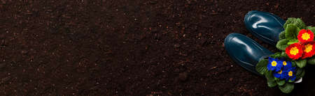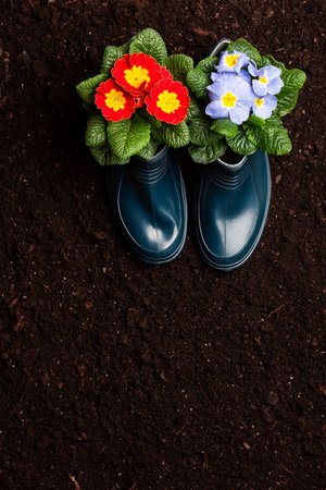 Blooming Primula Primrose in Garden rubber shoes on turf soil.