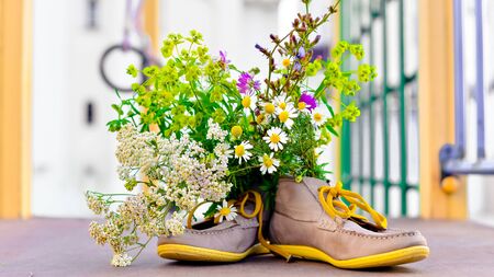 Shoes with a bouquet of white wildflowers anemone inside. Selected focus