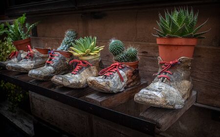 Old Work Boots Used as Planters with Cactus and Succulent Plants..
