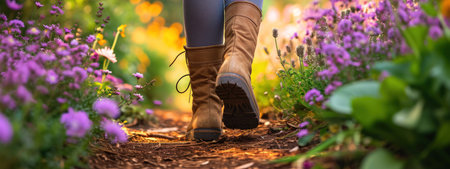 Female legs in jeans high boots with inserted flowers on the road in the field