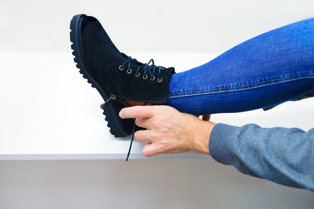 woman choosing new boots in the shop
