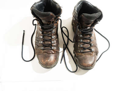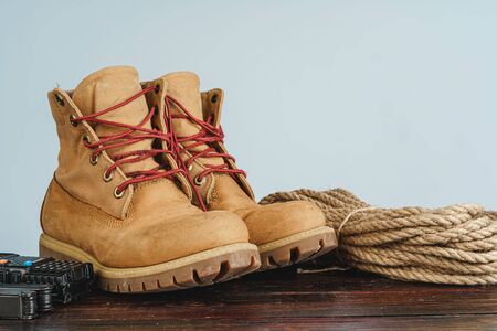 brown or yellow boot shoes for foot and adventure travel or keep walking journey with trekking on vintage white floor or ground and top view table with copy space
