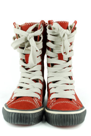 Red boots and untied shoelaces on brown background.