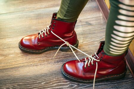 Female legs in stylish bright red boots with thick white laces tied together on wooden background, side view. Woman in funny pants and big size shoes. April Fools' day, pranks and fun.