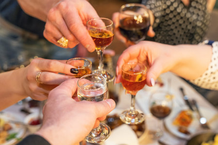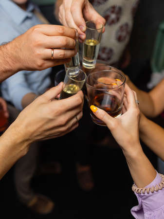 Close up shot of glasses clinking between group of friends drinking whiskey at night party in restaurant. They having so much fun drinking alcohol and talking together. Fun drinking party concept.