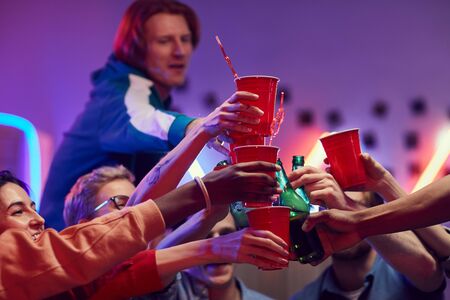 Happy. Hands of friends, colleagues during beer drinking, having fun, clinking bottles, glasses together. Flyer with copyspace. Oktoberfest, friendship, togetherness, happiness holidays concept