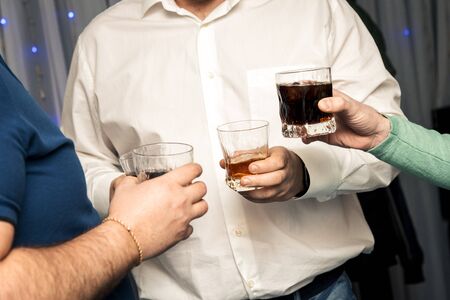 Clinking glasses with alcohol and toasting, party whiskey ice