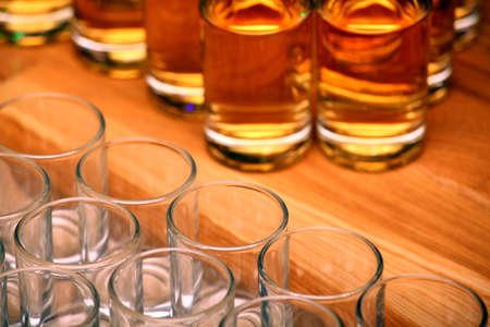 Red, strong alcoholic drink in small glasses on bar waiting to be served