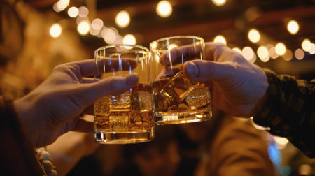 A close-up of two hands holding glasses of amber liquid with ice, clinking together in a toast.