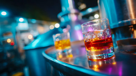 A lively composition featuring a vibrant cocktail with ice cubes, styled under bold and colorful lighting for a dynamic look.