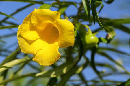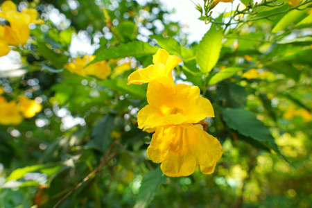 Yellow Trumpet Flower on the tree branch. Bush of Yellow elder