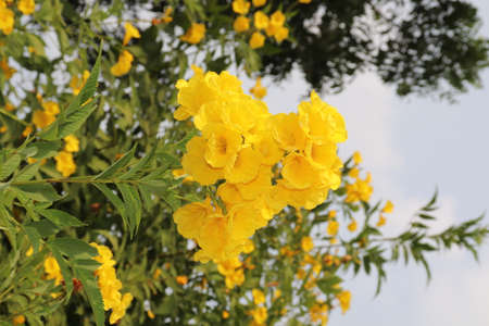 Yellow flower named Tecoma Stans or Yellow Bell, Yellow Elder, the flower has a beautiful color with a bright blue sky background. This flower was photographed in Thailand.