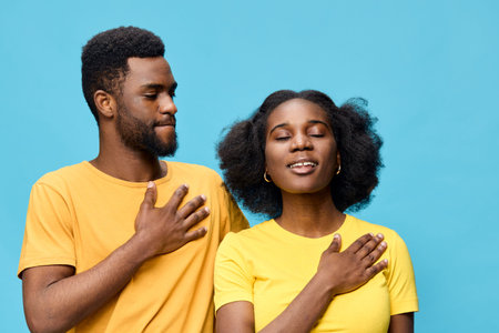 A joyful young African couple expressing gratitude in matching yellow t shirts against a bright blue background, reflecting positivity and love
