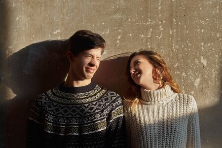 Portrait of happy young couple, standing by the wall concrete. Enjoying of morning sunlight from window. Deep shadows on the wall